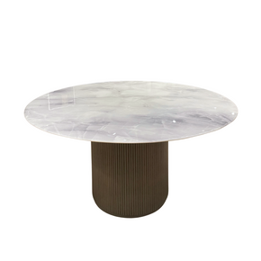 Mesa de comedor circular Linden de 150 cm de diámetro, con cubierta de mármol y base de madera con efecto lambrín moderno. Una pieza elegante y sofisticada que se convierte en...