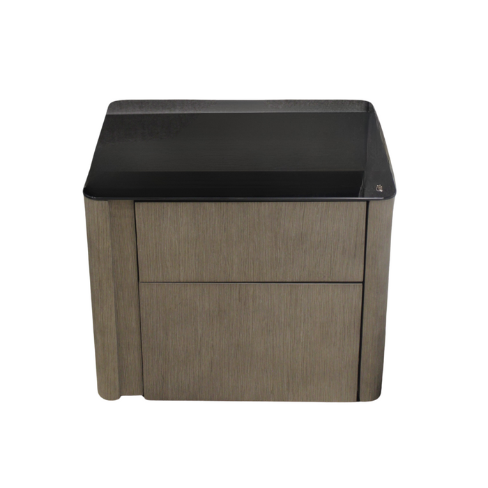 Buró Charleston con cubierta de espejo oscuro en color negro y dos cajones push, un diseño sofisticado que aporta modernidad y estilo a tu recámara.