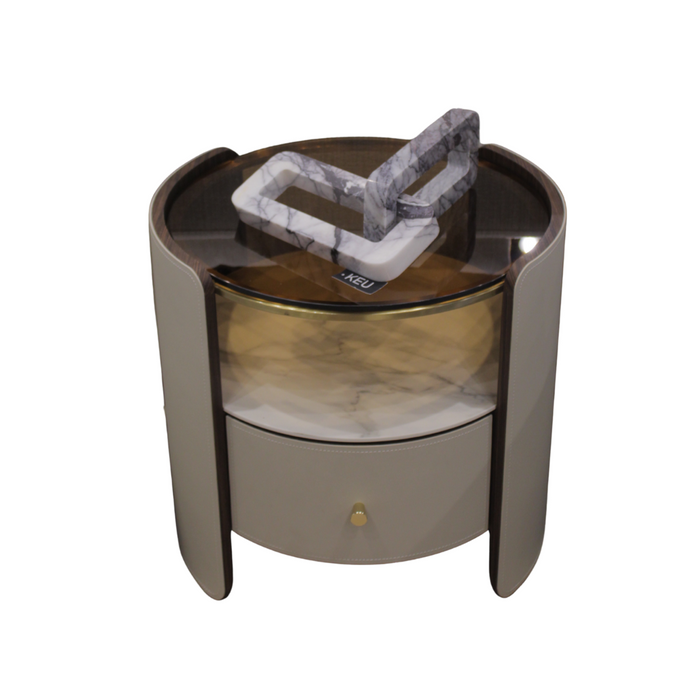 Buró Clayton, con cubierta de cristal color bronce y elegante borde dorado. Su cuerpo revestido en tipo piel aporta un acabado sofisticaddo con un cajón de almacenaje y cubierta mármol.