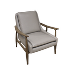 Sillón fabricado en tela con patas de madera en acabado natural.