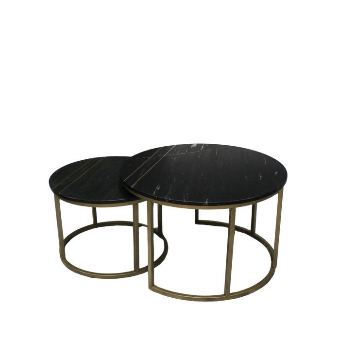 Set de dos Mesas de Centro Prusia, en color negro con efecto mármol y un elegante detalle de dos líneas doradas en la cubierta. Sus patas en tono dorado viejo aportan un aire sofisticado y moderno, perfectas para realzar tu sala con estilo y distinción.