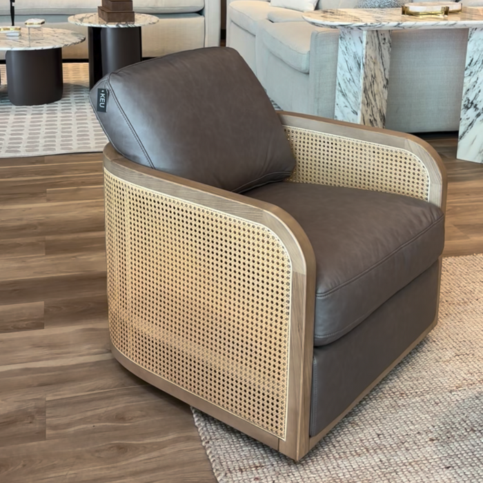 Sillón ocasional Azzura giratorio, con laterales revestidos en ratán que aportan un toque distintivo y natural. Su diseño mezcla texturas al combinar el ratán con el tapizado del sillón, creando una pieza versátil y elegante.