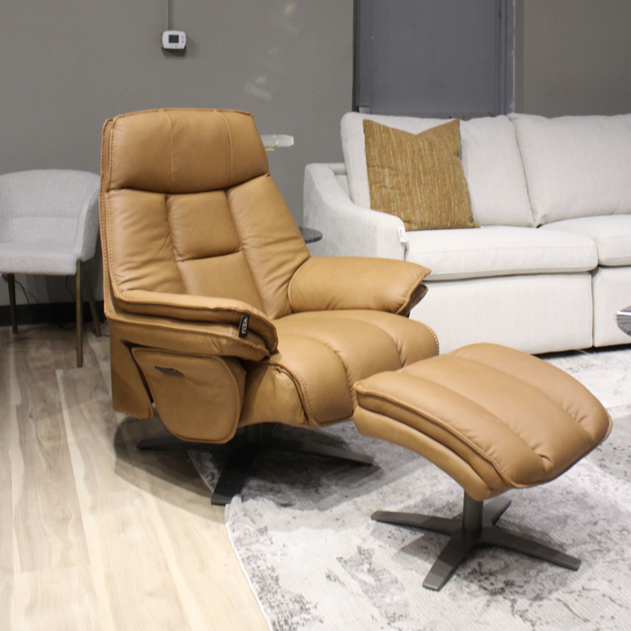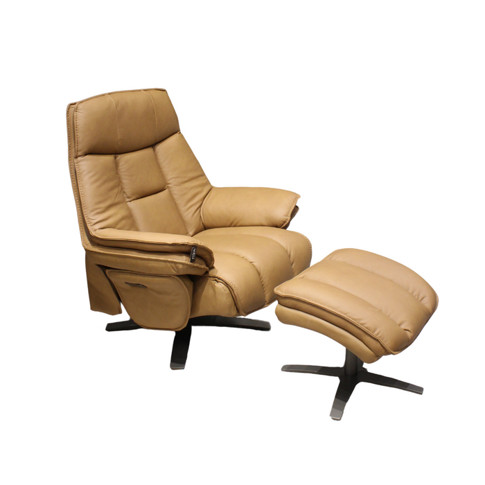 Sillón reclinable con ottoman Montego en piel, una pieza elegante y cómoda que combina diseño y funcionalidad para transformar tus momentos de descanso.